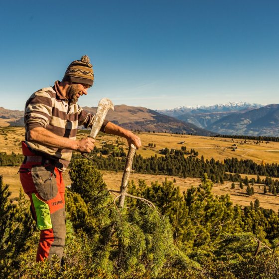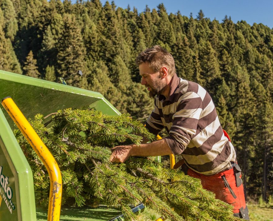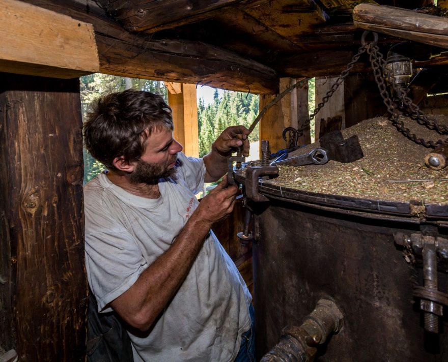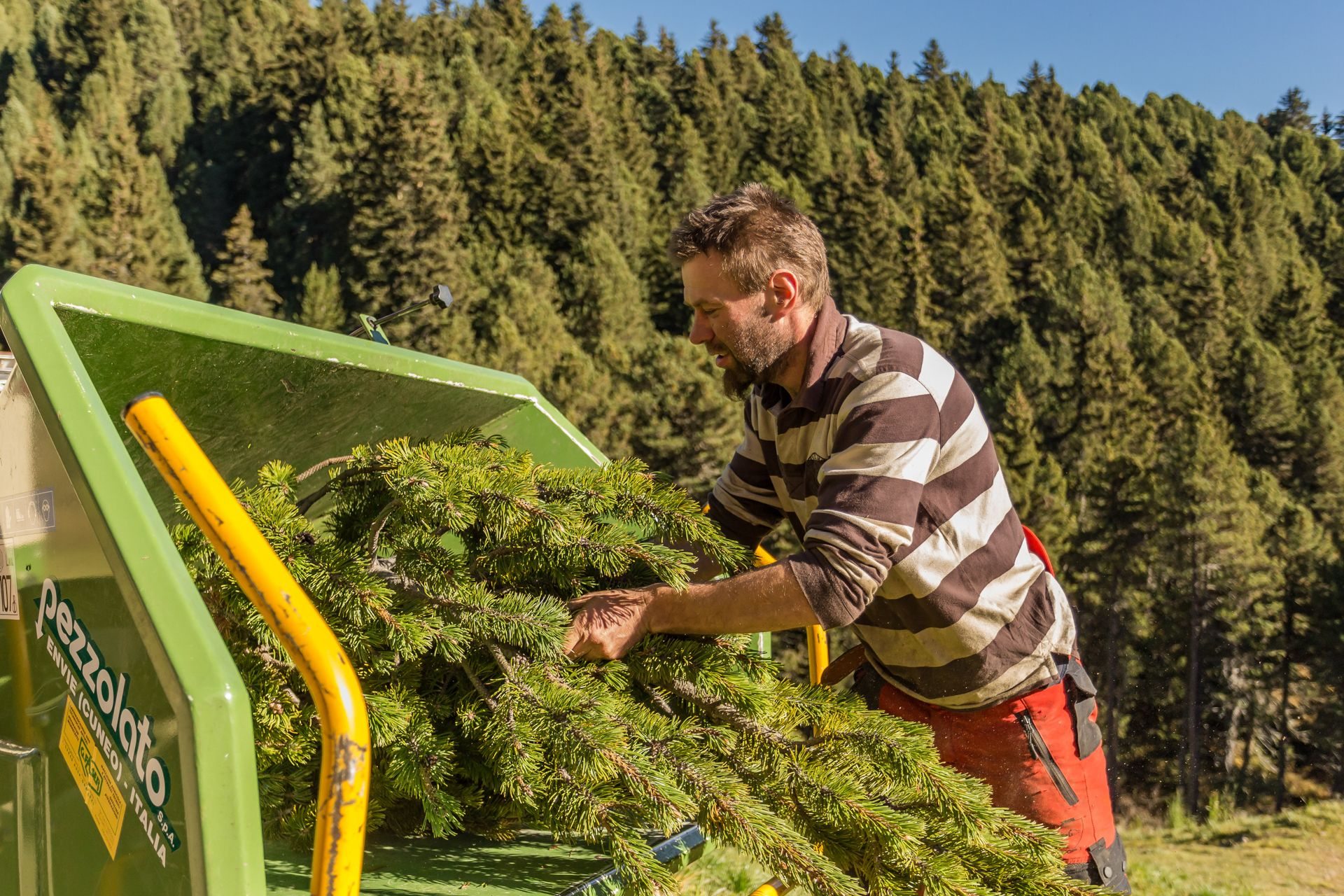 In primavera ed in autunno, sull’Alpe di Barbiano, vengono abbattuti i pini cembro e mugo selvatici. Tutto ciò avviene nel rispetto della natura e in un’ottica di salvaguardia e mantenimento della popolazione arborea. Successivamente, i ramoscelli e i rami vengono lasciati essiccare per circa due settimane. Ciò permette l'evaporazione dell'acqua in eccesso. Successivamente i rami vengono tagliati in piccoli pezzettini. Indispensabile per agevolare l’estrazione degli oli durante la distillazione.