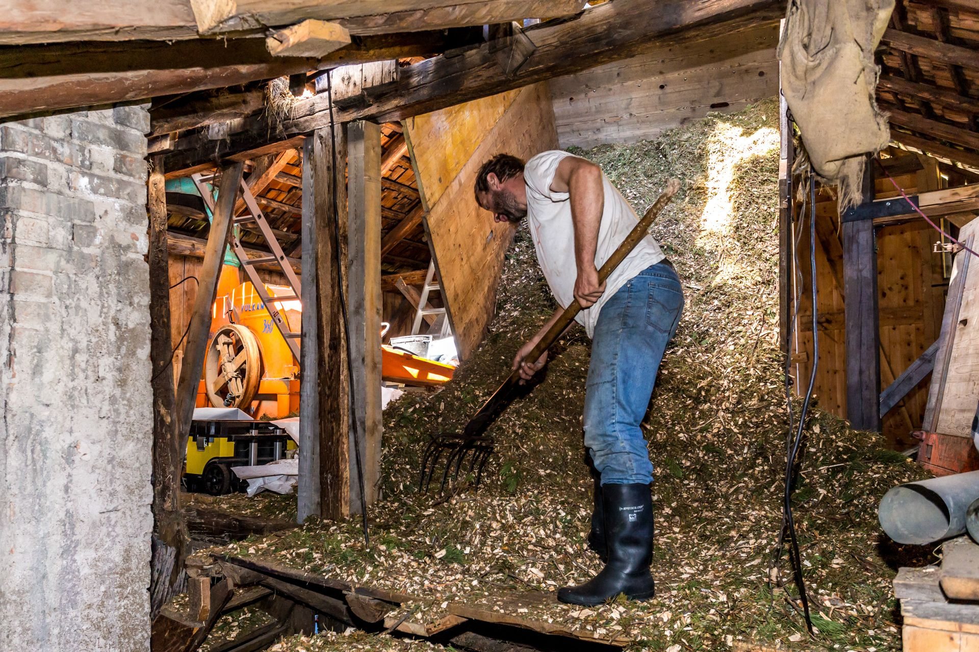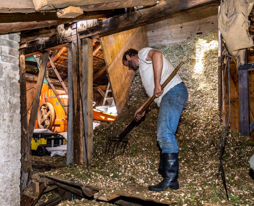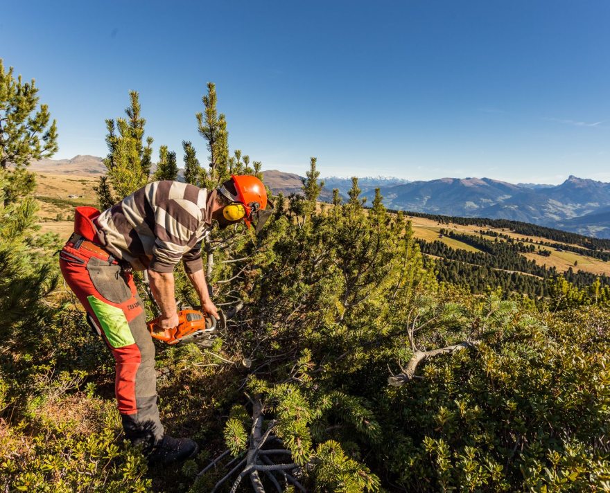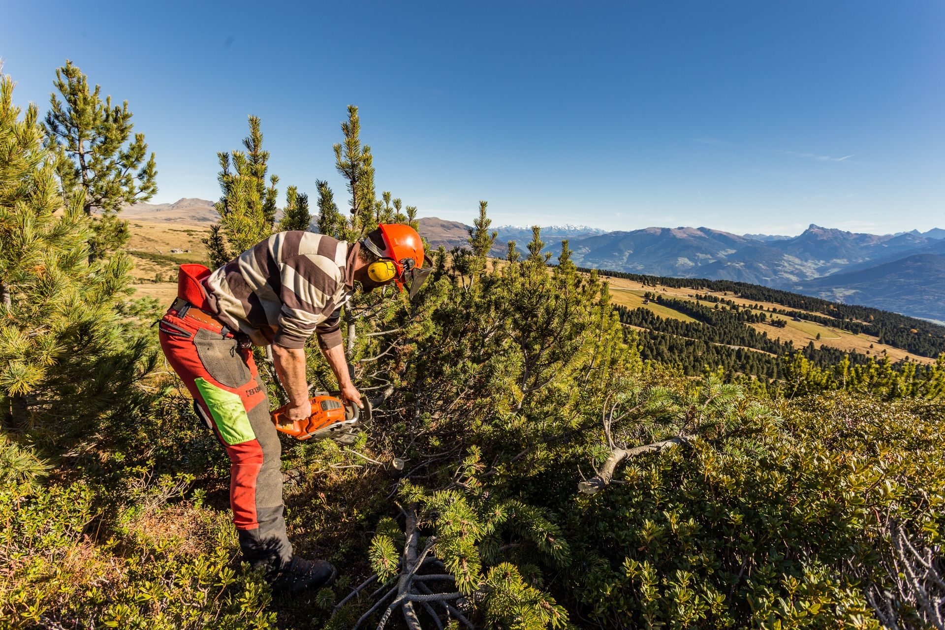 In primavera ed in autunno, sull’Alpe di Barbiano, vengono abbattuti i pini cembro e mugo selvatici. Tutto ciò avviene nel rispetto della natura e in un’ottica di salvaguardia e mantenimento della popolazione arborea. Successivamente, i ramoscelli e i rami vengono lasciati essiccare per circa due settimane. Ciò permette l'evaporazione dell'acqua in eccesso. Successivamente i rami vengono tagliati in piccoli pezzettini. Indispensabile per agevolare l’estrazione degli oli durante la distillazione.