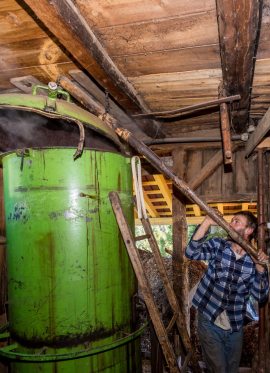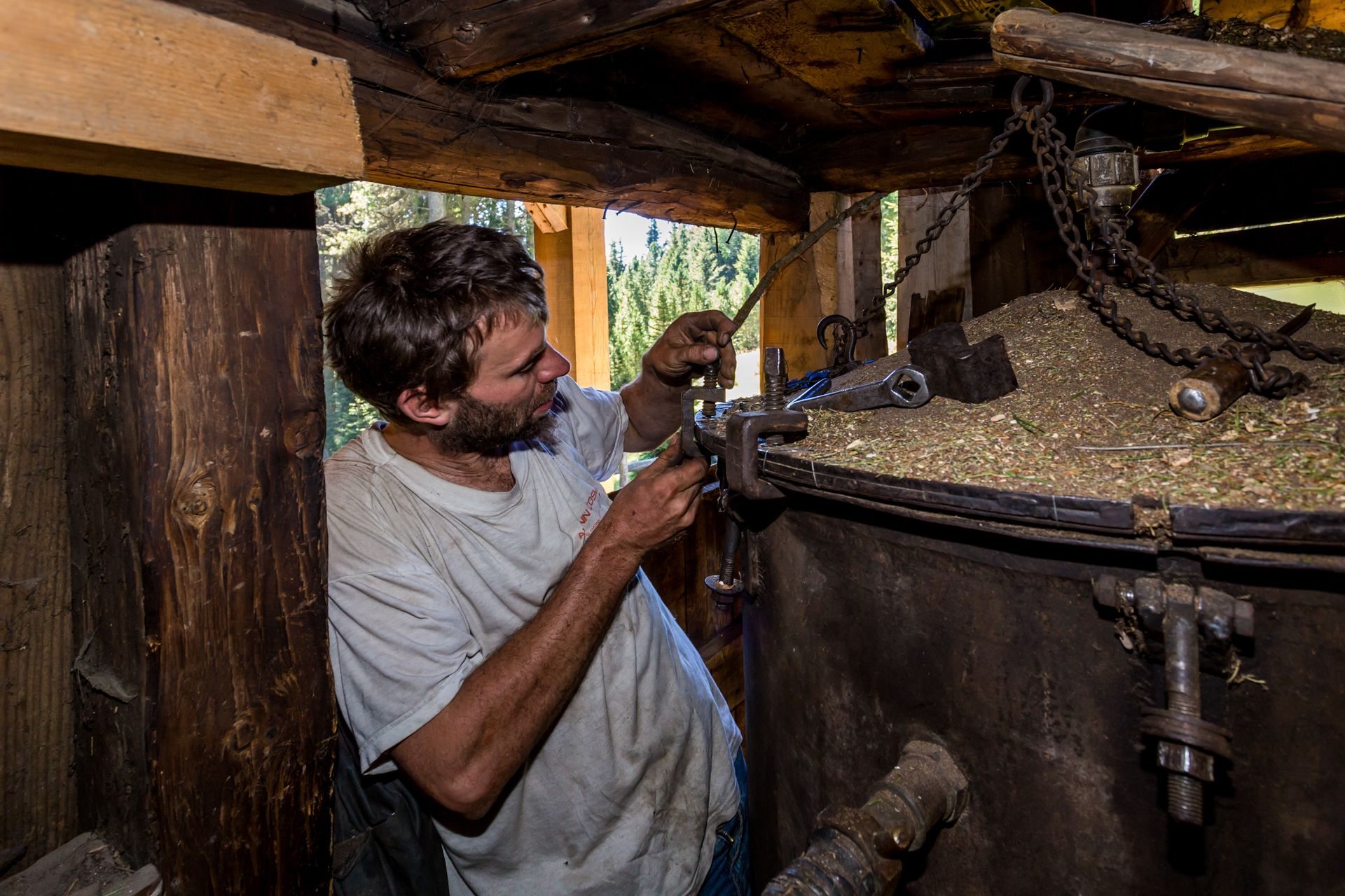 Per la distillazione è necessaria una grande quantità di vapore acqueo. Questo viene prodotto da una caldaia. Il vapore, quindi, sale verso l'alto e durante l’ascensione del vapore vengono liberati i preziosi oli essenziali contenuti nella massa di aghi e rami tagliati.