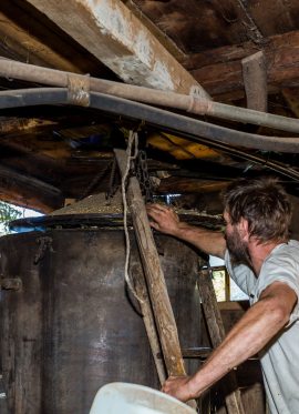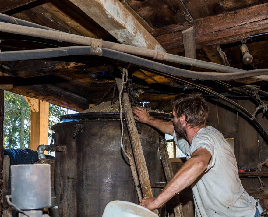Trasportiamo con il trattore il materiale tagliato in distilleria, dove viene distillato con l’aiuto di un alambicco.